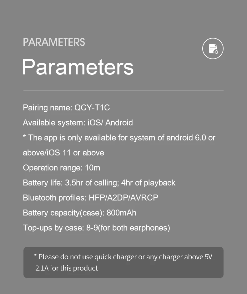 SPECIFICATIONS Product QCY T1C POWER TWS Bluetooth V5.0 Sports Wireless Earphones 3D Stereo headphones Mini in Ear Dual Microphone With Charging box