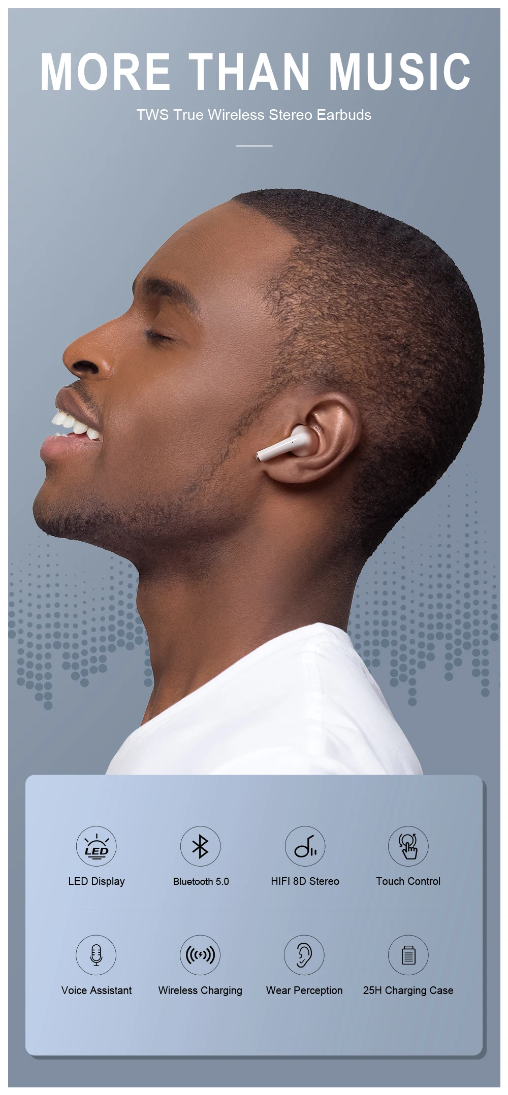 New Features:Press volume control Reverse magnetic lid*NEW* Pop up animation connect (Open the lid, no need to take out the Earbuds) Android smartphone Open the lid to search bluetooth name to pairing !In-ear Smart SensorMusic time-4hoursQI Wireless Charging Pop up 3 Real Battery show !Separate use Left earphone and Right earphoneHD MIC better than i200 i5000 i50000 TWSPressure Sensor Control like Original Enhanced bass/audio quality Super bassAuto power onAuto power offBinaural callsPrevious song, Next songVoice assistant